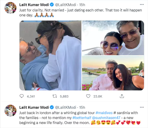 సుష్మితా సేన్ తో కలిసి ఉన్న ఫోటోలను ట్విట్టర్ లో షేర్ చేసిన లలిత్ మోడీ.. "మాల్దీవుల్లో షికార్లు కొట్టి లండన్ కి తిరిగి వచ్చాము. నా బెటర్ హాఫ్ సుష్మితతో కొత్త జీవితం ప్రారంభించినందుకు చాలా సంతోషంగా ఉంది." అని ట్వీట్ చేశాడు. సుష్మితను బెటర్ హాఫ్ అని చెప్పడంతో వీరిద్దరికీ పెళ్లి అయిపోయిందని వార్తలు స్టార్ట్ అయ్యాయి. దీంతో మరో ట్వీట్ లో పెళ్లి గురించి క్లారిటీ ఇచ్చాడు లలిత్ మోడీ. తమకు ఇంకా పెళ్లి కాలేదని, ప్రస్తుతం డేటింగ్ లో ఉన్నామని, త్వరలోనే పెళ్లి కూడా చేసుకుంటామని చెప్పుకొచ్చాడు.