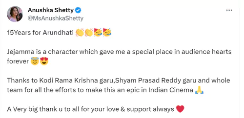 'అరుంధతి' చిత్రం 15 వసంతాలు పూర్తి చేసుకున్న సందర్భంగా అనుష్క తన సంతోషం వ్యక్తం చేసింది. ప్రేక్షకుల హృదయాల్లో తనకు ఎప్పటికీ ప్రత్యేక స్థానం కల్పించిన పాత్ర జేజమ్మ అని ట్వీట్ చేసిన అనుష్క.. ఇలాంటి చిత్రాన్ని అందించిన టీంకి, ఆదరించిన ప్రేక్షకులకు ధన్యవాదాలు తెలిపింది.