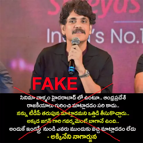"సినిమా వాళ్ళం హైదరాబాద్ లో ఉంటూ.. ఆంధ్రప్రదేశ్ రాజకీయాల గురించి మాట్లాడటం సరికాదు. నన్ను టీడీపీ తరపున మాట్లాడమని ఒత్తిడి తీసుకొచ్చారు. అక్కడ జగన్ గారి గవర్నమెంట్ బాగానే ఉంది. అందుకే ఇండస్ట్రీ నుండి ఎవరు ముందుకు వచ్చి మాట్లాడడం లేదు." అని నాగార్జున అధికార పార్టీకి అనుకూలంగా కామెంట్స్ చేసినట్లుగా ఒక ఫొటో సోషల్ మీడియాలో చక్కర్లు కొడుతోంది.