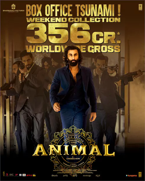 యానిమల్ మూవీ కేవలం మూడంటే మూడు రోజుల్లో వరల్డ్ వైడ్ గా 356 కోట్ల రూపాయిల గ్రాస్ ని సాధించింది. తొలి రోజు 116 కోట్ల గ్రాస్ ని సాధించిన యానిమల్ ఆ తర్వాత రెండు రోజులకి అంటే వీకెండ్స్ అయిన శని, ఆదివారాల్లో రికార్డు స్థాయి కలెక్షన్స్ ని సాధించింది. ఇప్పుడు ఈ కలెక్షన్స్ తో సినిమా హిట్ రేంజ్ అందరికి అర్ధం అయ్యింది. విడుదల అయిన అన్ని చోట్ల హౌస్ ఫుల్స్ తో దూసుకెళ్తున్న యానిమల్ రాబోయే రోజుల్లో మరిన్ని కొత్త రికార్డులు సృష్టించడం ఖాయమని సినీ విశ్లేషకులు అభిప్రాయ పడుతున్నారు.