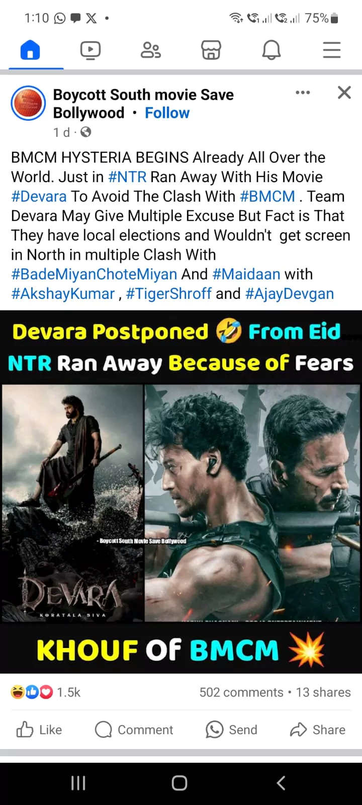 బాలీవుడ్ అగ్ర నటులైన అక్షయ్ కుమార్,టైగర్ ష్రఫ్ లు కలిసి బడేమియా చోట మియా అనే మూవీలో నటిస్తున్నారు. ఏప్రిల్ 10న విడుదల కాబోతున్న ఈ మూవీకి ఎన్టీఆర్ భయపడి తన దేవర ని పోస్ట్ పోన్ చేస్తున్నాడంటూ బాలీవుడ్ ఎన్టీఆర్ మీద ట్రోల్ల్స్ చేస్తుంది. దేవర వెనక్కి వెళ్లే పరిస్థితులని కనిపెట్టిన బాలీవుడ్ పని గట్టుకొని మరి ట్రోల్ల్స్ చేస్తుంది దేవర షూటింగ్ స్టార్ అయినప్పటి నుంచి కూడా దేవర వరల్డ్ వైడ్ గా ఏప్రిల్ 5 న రిలీజ్ అవుతుందనే విషయాన్ని మేకర్స్ అఫిషియల్ గా డిక్లైర్ చేసారు.
