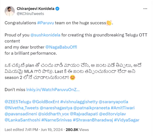 'పరువు' టీం కి సోషల్ మీడియా వేదికగా శుభాకాంక్షలు తెలిపారు చిరంజీవి. తన కూతురు సుష్మిత ఇలాంటి అద్భుతమైన సిరీస్ ను నిర్మించడం పట్ల గర్వంగా ఉందని అన్నారు. అలాగే సోదరుడు నాగబాబు అద్భుతంగా ఉందని కొనియాడారు. అంతేకాదు, "ఒక చక్కటి ప్లాన్ తో చందు బాడీ మాయం చేసి, ఆ జంట పడే తిప్పలు, అదే విషయమై MLA గారి పాట్లు. లాస్ట్ కి ఈ జంట తప్పించుకుందా లేదా అని season 2 లోనే చూడాలనుకుంటా" అంటూ సీజన్ 2 గురించి కూడా ట్వీట్ చేశారు చిరంజీవి. ప్రస్తుతం ఈ ట్వీట్ వైరల్ గా మారింది. చిరు ట్వీట్ తో పరువు సిరీస్ చూసే వారి సంఖ్య మరింత పెరిగే అవకాశముంది.