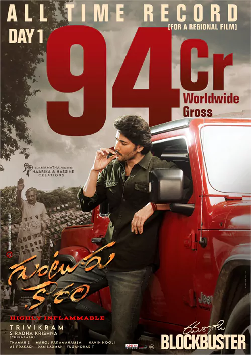 గుంటూరు కారం మొదటి రోజు 94 కోట్ల రూపాయలని సాధించింది. ప్రపంచ వ్యాప్తంగా విడుదలైన అన్ని చోట్ల కూడా రికార్డు కలెక్షన్స్ ని సాధిస్తు అక్షరాలా 94 కోట్ల రూపాయిల గ్రాస్ ని సాధించింది.దీంతో కేవలం ప్రాంతీయ భాష తెలుగులో మాత్రమే రిలీజైన గుంటూరు కారం రీజనల్ సినిమాల్లో నెంబర్ వన్ గా నిలిచింది. సినీ ట్రేడ్ వర్గాలు కూడా గుంటూరు కారం కలెక్షన్ల విషయంలో విస్మయాన్ని వ్యక్తం చేస్తున్నాయి.