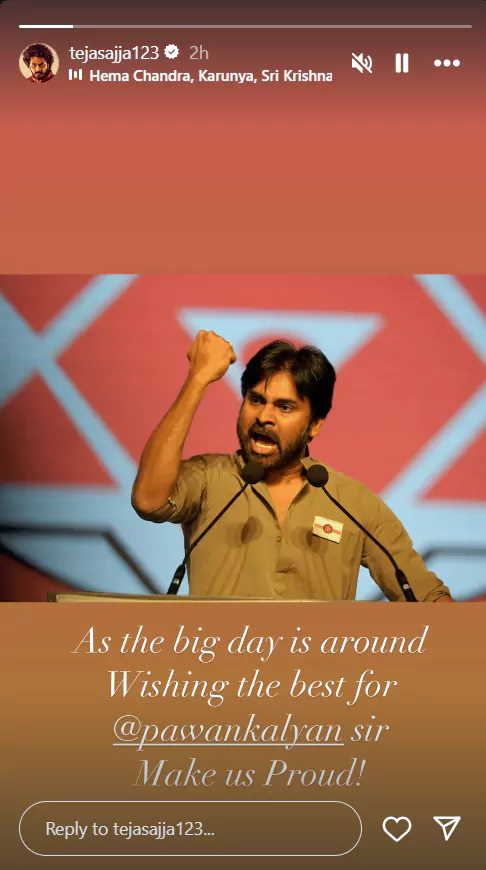 తాజాగా సోషల్ మీడియా వేదికగా జనసేనాని కి తన మద్దతు తెలిపాడు తేజ. రాబోయే ఎన్నికల్లో పవన్ కళ్యాణ్ విజయం సాధించాలని ఆకాంక్షిస్తూ తేజ ఆయనకు ఆల్ ది బెస్ట్ చెప్పాడు. ప్రస్తుతం ఈ పోస్ట్ సోషల్ మీడియాలో వైరల్ గా మారింది.