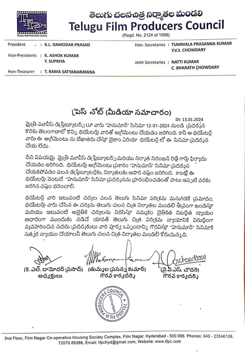 ఇప్పుడు ఈ అంశాలన్నిటినీ ప్రస్తావిస్తు నిర్మాత మండలి ఒక ప్రెస్ నోట్ రిలీజ్ చేసింది. ఇలాంటి చర్యలు తెలుగు చిత్ర పరిశ్రమకు మనుగడకే చాలా ప్రమాదమని థియేటర్ ఓనర్స్ న్యాయాన్ని గౌరవిస్తు ఒప్పందం ప్రకారం వెంటనే హనుమాన్ ని ప్రదరించాలని అలాగే నిర్మాతకి డిస్ట్రిబ్యూటర్ కి జరిగిన నష్టాన్ని కూడా థియేటర్స్ వాళ్లే భరించాలని చెప్పింది