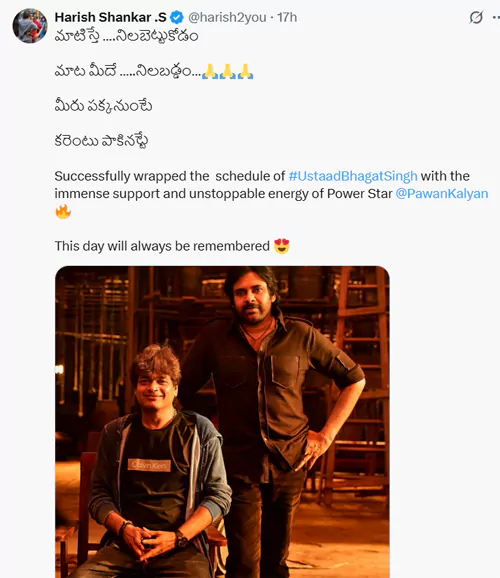 'గబ్బర్ సింగ్' వంటి బ్లాక్ బస్టర్ తర్వాత పవర్ స్టార్ పవన్ కళ్యాణ్, డైరెక్టర్ హరీష్ శంకర్ కాంబినేషన్ లో రూపొందుతోన్న చిత్రం 'ఉస్తాద్ భగత్ సింగ్'. మైత్రి మూవీ మేకర్స్ నిర్మిస్తున్న ఈ సినిమాలో శ్రీలీల, రాశి ఖన్నా హీరోయిన్లుగా నటిస్తున్నారు. ఈ మూవీ షూటింగ్ శరవేగంగా జరుగుతోంది. తాజాగా ఓ కీలక షెడ్యూల్ పూర్తయింది. ఈ నేపథ్యంలో సోషల్ మీడియా వేదికగా తన సంతోషాన్ని పంచుకున్నారు డైరెక్టర్ హరీష్ శంకర్.