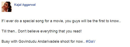 Actress Kajal Aggarwal swiftly rubbished rumours about her item number in the upcoming movie 'Geethanjali'. There had been talks on Social Media about Kajal Aggarwal's item number in Geethanjali and some even mentioned that the actress was paid a huge amount for performing in this special song. However, Kajal made sure to address this matter and posted a clarification on her Facebook page. Here is a snapshot of what Kajal Aggarwal posted on the Social Networking site !!!