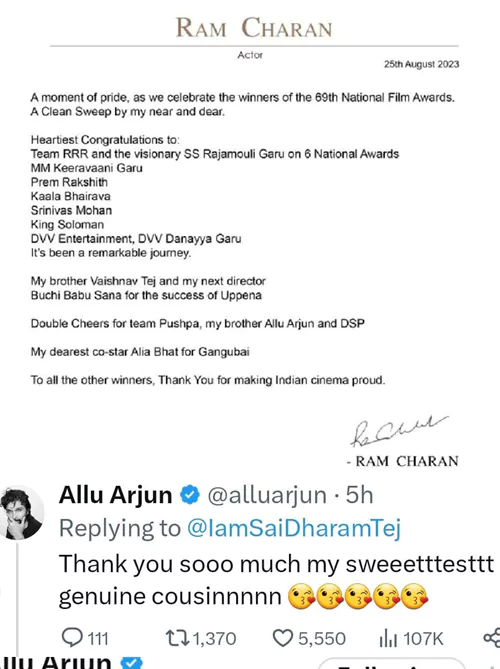 69వ జాతీయ చలన చిత్ర అవార్డులలో పుష్ప చిత్రానికి గాను ఉత్తమ నటుడిగా అల్లు అర్జున్ అవార్డు గెలుచుకున్న సంగతి తెలిసిందే. బన్నీ అవార్డు గెలుచుకోవడం పట్ల శుభాకాంక్షలు వెల్లువెత్తుతున్నాయి. శుభాకాంక్షలు బావ అంటూ ఎన్టీఆర్ ప్రత్యేకంగా ట్వీట్ చేయగా.. నీ జెన్యూన్ విషెస్ కి థాంక్యూ బావ అంటూ బన్నీ రిప్లై ఇచ్చాడు. అయితే చరణ్ మాత్రం బన్నీకి ప్రత్యేకంగా శుభాకాంక్షలు తెలపకుండా, మిగతా విజేతలతో కలిపి విష్ చేశాడు. బన్నీ కూడా అందుకు తగ్గట్టుగానే థాంక్యూ అంటూ ఏదో బయటవారికి రిప్లై ఇచ్చినట్లుగా ఇచ్చాడు. ఇక తనని ప్రత్యేకంగా విష్ చేస్తూ మరో మెగా హీరో సాయి ధరమ్ తేజ్ ట్వీట్ చేయగా.. థాంక్యూ సో మచ్ మై స్వీటెస్ట్ జెన్యూన్ కజిన్ అని రిప్లై ఇచ్చాడు.