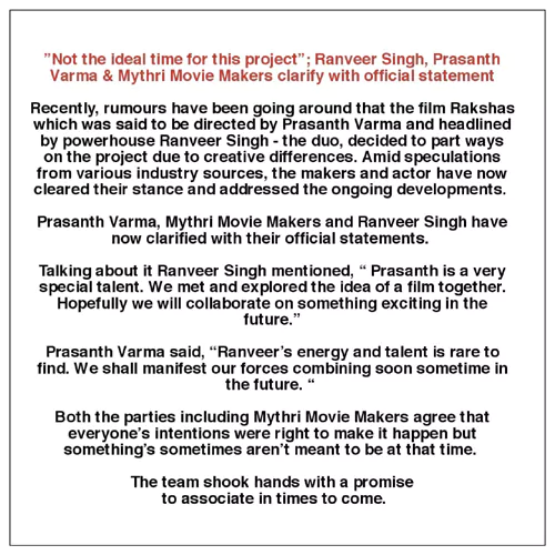 ప్రస్తుతం 'రాక్షస' ప్రాజెక్ట్ లేదని, కానీ భవిష్యత్ లో ఖచ్చితంగా రణవీర్ సింగ్-ప్రశాంత్ వర్మ కాంబినేషన్ లో సినిమా ఉంటుందని తెలుపుతూ మైత్రి ప్రెస్ నోట్ విడుదల చేసింది. అందులో రణవీర్, ప్రశాంత్ స్టేట్ మెంట్ లు కూడా ఉన్నాయి. "ప్రశాంత్ ఎంతో ప్రతిభావంతుడు. భవిష్యత్ లో తప్పకుండా మేమిద్దరం కలిసి పని చేస్తాం." అని రణవీర్ అన్నారు."రణవీర్ అరుదైన నటుడు. భవిష్యత్ తో ఆయనతో కలిసి సినిమా చేస్తాను." అని ప్రశాంత్ అన్నారు.