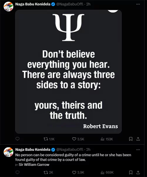 "న్యాయస్థానం ద్వారా నేరం రుజువయ్యే వరకు.. ఏ వ్యక్తిని నేరానికి పాల్పడినట్లుగా పరిగణించలేము." అని నాగబాబు ట్వీట్ చేశారు. మరో ట్వీట్ లో "మీరు విన్న ప్రతి విషయాన్ని నమ్మకండి. ప్రతి కథకి మూడు కోణాలు ఉంటాయి. ఒకటి మన కోణం, రెండోది ఇతరుల కోణం, మూడోది నిజం." అంటూ నాగబాబు రాసుకొచ్చారు.