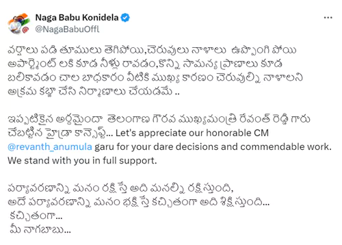 "వర్షాలు పడి తూములు తెగిపోయి, చెరువులు నాళాలు ఉప్పొంగి పోయి అపార్ట్మెంట్ లకి కూడ నీళ్లు రావడం, కొన్ని సామన్య ప్రాణాలు కూడ బలికావడం చాల బాధకారం వీటికి ముఖ్య కారణం చెరువుల్ని నాళాలని అక్రమ కబ్జా చేసి నిర్మాణాలు చేయడమే. ఇప్పటికైన అర్ధమైందా తెలంగాణ గౌరవ ముఖ్యమంత్రి రేవంత్ రెడ్డి గారు చేబట్టిన హైడ్రా కాన్సెప్ట్. సాహసోపేత నిర్ణయాలకు, ప్రశంసనీయమైన పనికి మన గౌరవ ముఖ్యమంత్రి రేవంత్ రెడ్డి గారిని అభినందిద్దాం. ఆయనకు పూర్తి మద్దతుగా నిలుద్దాం. పర్యావరణాన్ని మనం రక్షిస్తే అది మనల్ని రక్షిస్తుంది, అదే పర్యావరణాన్ని మనం భక్షిస్తే కచ్చితంగా అది శిక్షిస్తుంది.. కచ్చితంగా..." అంటూ నాగబాబు రాసుకొచ్చారు. ప్రస్తుతం ఈ పోస్ట్ వైరల్ గా మారింది.