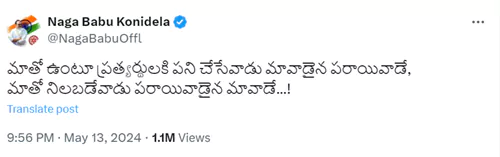 మే 13న ఆంధ్రప్రదేశ్ లో పోలింగ్ జరిగింది. పోలింగ్ ముగిశాక, నాగబాబు చేసిన ఓ ట్వీట్ హాట్ టాపిక్ గా మారింది. "మాతో ఉంటూ ప్రత్యర్థులకి పని చేసేవాడు మావాడైనా పరాయివాడే. మాతో నిలబడేవాడు పరాయివాడైనా మావాడే." అని నాగబాబు ట్వీట్ చేశారు. అయితే లో ఈ ట్వీట్ లో.. మొదటి లైన్ అల్లు అర్జున్ ని, రెండో లైన్ ఎస్.వి.ఎస్.ఎన్. వర్మని ఉద్దేశించి చేసినట్లు ఉందని అభిమానులు అభిప్రాయపడుతున్నారు.