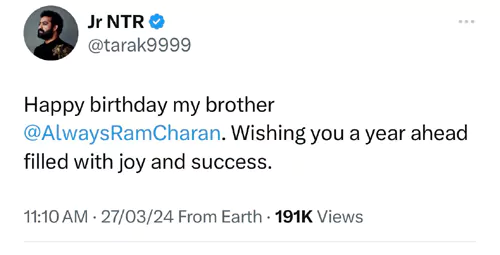 ఈ రోజు ప్రముఖ హీరో రామ్ చరణ్ (ram charan) పుట్టిన రోజు. ఈ సందర్భంగా ఎన్టీఆర్ తన ట్విటర్ వేదికగా చరణ్ కి శుభాకాంక్షలు తెలిపాడు. హ్యాపీ బర్త్ డే మై బ్రదర్ విషింగ్ ఆ ఇయర్ ఏ హెడ్ ఫిల్డ్ విత్ జాయ్ అండ్ సక్సెస్ అని పోస్ట్ చేసాడు. అంటే సంతోషం మరియు విజయంతో చరణ్ ముందుకు సాగాలని కోరుకుంటున్నట్టు చెప్పాడు. ఇప్పుడు ఈ పోస్ట్ వైరల్ గా మారింది. ఇరువురి ఫ్యాన్స్ కూడా వాళ్ళ స్నేహానికి మురిసిపోతున్నారు. అలాగే చరణ్ కి బర్త్ డే విషెస్ కూడా చెప్తున్నారు.