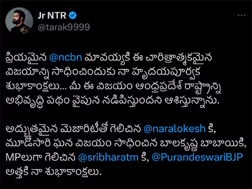 ప్రియమైన చంద్రబాబు నాయుడి మావయ్యకి చారిత్రాత్మకమైన విజయాన్ని సాధించిందుకు నా హృదయపూర్వక శుభాకాంక్షలు. మీ ఈ విజయం ఆంధ్రప్రదేశ్ రాష్ట్రాన్ని అభివృద్ధి పథం వైపున నడిపిస్తుందని ఆశిస్తున్నాను. అలాగే అద్భుతమైన మెజారిటీతో గెలిచిన నారా లోకేష్ కి మూడోసారి ఘన విజయం సాధించిన బాలకృష్ణ (balakrishna)బాబాయికి, MPలుగా గెలిచిన భరత్ కి శుభాకాంక్షలు అని చెప్పాడు. అదే విధంగా బి జె పి తరుపున గెలిచిన పురందేశ్వరి అత్తకి అలాగే ఇంతటి ఘనవిజయం సాధించిన పవన్ కళ్యాణ్ (pawan kalyan) గారికి కూడా నా హృదయపూర్వక శుభాకాంక్షలు అని కూడా తెలియచేసాడు. ఇక ఈ ట్వీట్ తో ఎన్టీఆర్ అభిమానులు ఎంతో ఆనందంగా ఉన్నారు.