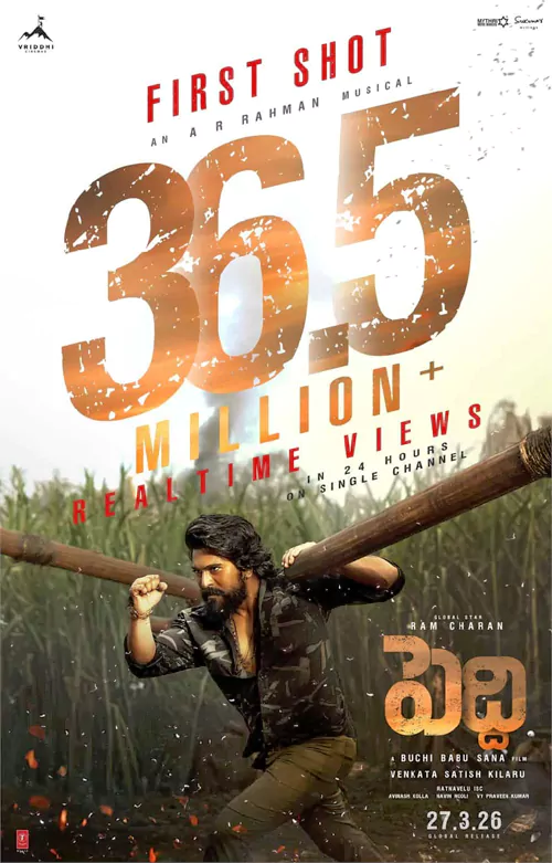 ఇప్పుడు ఈ మూవీ గ్లింప్స్ రిలీజైన 24 గంటల్లోనే 36 .05 మిలియన్ల వ్యూస్ ని సాధించి సరికొత్త రికార్డుని నెలకొల్పింది.దీంతో ఇప్పటి వరకు అత్యధిక వ్యూస్ జాబితాలో ఉన్న దేవర 26 .17 మిలియన్లు, పుష్ప 2 20 .45 మిలియన్ల వ్యూస్ రికార్డుని 'పెద్ది' దాటేసాడని అభిమానులు సోషల్ మీడియా వేదికగా షేర్ చేస్తున్నారు.పెద్ది గ్లింప్స్ కి వస్తున్న రెస్పాన్స్ కి తనతో పాటు చిత్ర బృందం మొత్తం ఎంతో ఆనందపడుతుందని చరణ్ తెలిపాడు.