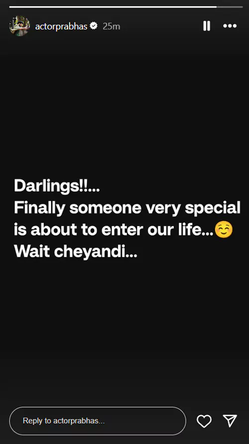 తాజాగా ఇన్ స్టాగ్రామ్ లో ప్రభాస్ ఓ స్టోరీ పెట్టాడు. అందులో "డార్లింగ్స్.. మొత్తానికి ఒక స్పెషల్ పర్సన్ జీవితంలోకి రాబోతున్నారు.. వెయిట్ చేయండి" అంటూ ప్రభాస్ రాసుకొచ్చాడు. దీంతో ఆ స్పెషల్ పర్సనా ఎవరా? అని అందరూ ఆరాలు తీయడం మొదలుపెట్టారు. కొందరు అభిమానులైతే అనుష్క శెట్టి (Anushka Shetty) అయ్యుంటుందని కామెంట్స్ పెడుతున్నారు. మరి ప్రభాస్ జీవితంలోకి రాబోతున్న ఆ స్పెషల్ పర్సన్ ఎవరు? అనేది త్వరలోనే రివీల్ అయ్యే అవకాశముంది.