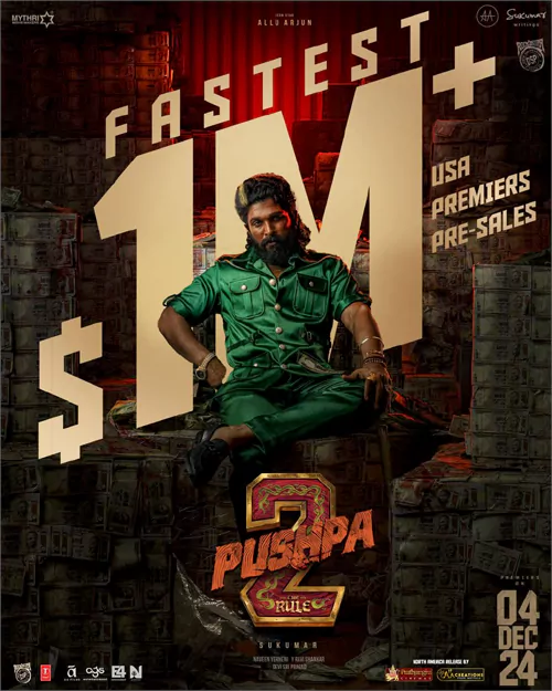 ఓవర్సీస్ కి సంబంధించి యుఎస్ లో పుష్ప 2 ప్రీమియర్ ప్రీ సేల్స్ బుకింగ్స్ ని ఓపెన్ చెయ్యగా, టికెట్స్ అన్ని కూడా హాట్ కేకుల్లా అమ్ముడయ్యాయి. ఏకంగా వన్ మిలియన్ డాలర్ల కి పైగా రాబట్టి తన సత్తా చాటింది. యుఎస్ బాక్స్ ఆఫీస్ వద్ద అత్యంత వేగంగా వన్ మిలియన్ డాలర్ల మార్కుని సాధించిన మొట్ట మొదటి భారతీయ చిత్రంగా కూడా నిలిచింది.దీంతో సిల్వర్ స్క్రీన్ వద్ద పుష్ప రాజ్ ఆధిపత్యం సరికొత్త డైమన్షన్ని క్రియేట్ చేసినట్లయ్యింది. రిలీజ్ టైంకి రోజుకొక రికార్డుని తన ఖాతాలో వేసుకొని సరికొత్త చరిత్రని కూడా సృష్టించడం ఖాయమని సినీ ట్రేడ్ వర్గాలు అభిప్రాయపడుతున్నాయి.