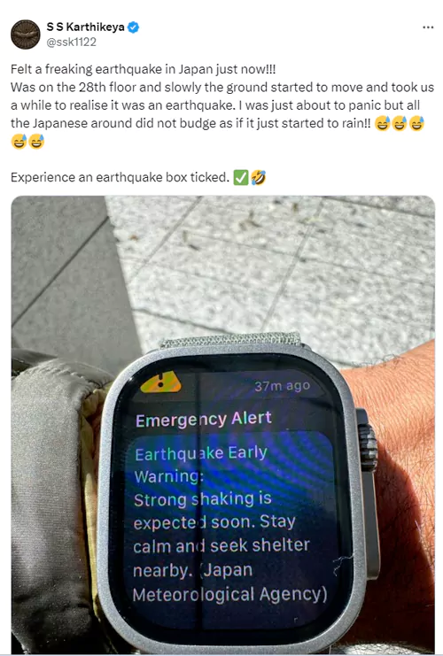 "జపాన్లో ఒక పెద్ద బిల్డింగ్లో మేము 28వ అంతస్తులో ఉన్నాం. సడెన్ గా బిల్డింగ్ కదులుతున్న ఫీలింగ్ కలిగింది. అది భూకంపం అని గ్రహించడానికి మాకు కొంత సమయం పట్టింది. భూకంపం అని తెలిసాక మేం భయపడ్డాం. కానీ చుట్టూ ఉన్న జపనీయులు మాత్రం ఏదో వర్షం పడుతున్నట్లుగా కూల్గా ఉన్నారు. మొత్తానికి భూకంపం ఎలా ఉంటుందో ఎక్స్పీరియన్స్ చేశాం." అని కార్తికేయ సోషల్ మీడియాలో రాసుకొచ్చాడు.