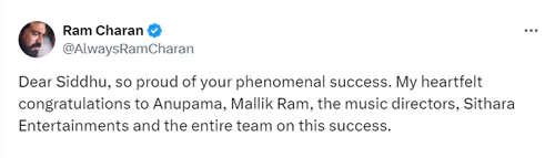 'టిల్లు స్క్వేర్' టీంని ప్రశంసిస్తూ తాజాగా రామ్ చరణ్ ట్వీట్ చేశాడు. "డియర్ సిద్ధూ, నువ్వు అద్భుతమైన విజయం సాధించడం పట్ల చాలా గర్వంగా ఉంది. హీరోయిన్ అనుపమ పరమేశ్వరన్, దర్శకుడు మల్లిక్ రామ్, సంగీత దర్శకులు, సితార ఎంటర్టైన్మెంట్స్ మరియు టీమ్ మొత్తానికి నా హృదయపూర్వక అభినందనలు." అని రాసుకొచ్చాడు.