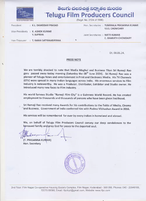 రామోజీరావు (ramoji rao)గారి మరణానికి సంతాపాన్ని ప్రకటిస్తు రేపు షూటింగ్ లు జరగవని ఫిలిం చాంబర్ కార్యదర్శి దామోదర్ ప్రసాద్ అధికారకంగా ఒక ప్రకటన విడుదల చేసారు.