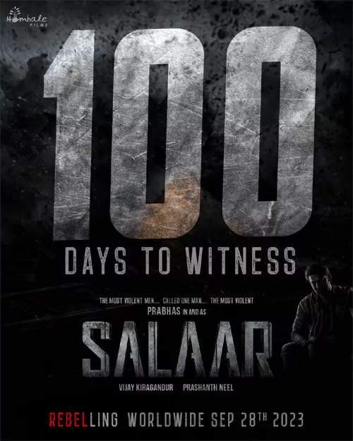 ప్రకటనతోనే ప్రభాస్, ప్రశాంత్ నీల్ కాంబినేషన్ లో రూపొందుతోన్న 'సలార్'పై భారీ అంచనాలు ఏర్పడ్డాయి. 'బాహుబలి' హీరో, 'కేజీఎఫ్' డైరెక్టర్ కలిసి చేస్తున్న ఈ సినిమా సంచనాలు సృష్టించడం ఖాయమనే అభిప్రాయాలు ఉన్నాయి. హోంబలే ఫిలిమ్స్ నిర్మిస్తున్న ఈ సినిమాని 2023, సెప్టెంబర్ 28 న విడుదల చేయనున్నట్లు ఎప్పుడో ప్రకటించారు. విడుదల తేదీలో మార్పు లేదని ఇప్పటికే పలుసార్లు క్లారిటీ ఇచ్చినప్పటికీ.. సలార్ రెండు భాగాలుగా తెరకెక్కుతోందని, విడుదల ఆలస్యమయ్యే అవకాశముందని ప్రచారం జరుగుతూనే ఉంది. తాజాగా మరోసారి ఆ ప్రచారానికి చెక్ పెట్టి, రిలీజ్ కౌంట్ డౌన్ చేశారు మేకర్స్. 'సలార్' విడుదలకు ఇంకా 100 రోజులే ఉందని గుర్తు చేస్తూ తాజాగా ప్రత్యేక పోస్టర్ ను విడుదల చేసింది హోంబలే ఫిలిమ్స్. 'ఆదిపురుష్' కలెక్షన్స్ డ్రాప్ అయ్యాయనే బాధలో ఉన్న ప్రభాస్ ఫ్యాన్స్ కి ఇది నిజంగా బూస్ట్ ఇచ్చే అప్డేట్ అని చెప్పాలి. అసలే 'సలార్' విడుదల కోసం ఎంతగానో ఎదురుచూస్తున్న ప్రభాస్ ఫ్యాన్స్.. తాజా అప్డేట్ తో తెగ సంబరపడుతున్నారు.