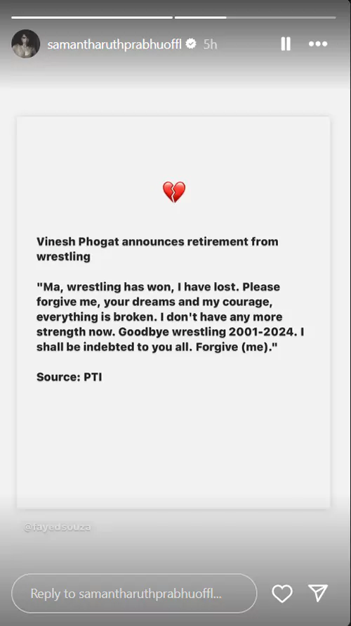 నాగ చైతన్య, శోభితా ధూళిపాళ్ల ఎంగేజ్ మెంట్ తాజాగా జరిగింది. దీంతో చైతన్య మాజీ భార్య, ప్రముఖ హీరోయిన్ సమంత దీనిపై ఏమైనా పరోక్షంగా స్పందిస్తుందా అని అందరూ ఎంతో ఆసక్తిగా ఎదురుచూస్తున్నారు. ఈ క్రమంలో సమంత ఊహించని విధంగా ఓ ఎమోషనల్ పోస్ట్ పెట్టింది. అయితే ఆ పోస్ట్ చైతన్య గురించి కాదు. ఒలింపిక్స్ లో ఫైనల్ కి వెళ్లిన ప్రముఖ రెజ్లర్ వినేశ్ ఫోగట్ పై అనూహ్యంగా 100 గ్రాముల అధిక బరువు కారణంగా అనర్హత వేటు పడిన సంగతి తెలిసిందే. ఈ క్రమంలో ఆమె రిటైర్ మెంట్ ని ప్రకటించింది. దీనిపై ఇన్ స్టాగ్రామ్ వేదికగా స్పందించిన సమంత.. హార్ట్ బ్రేక్ అయిన ఎమోజీని పోస్ట్ చేసింది.