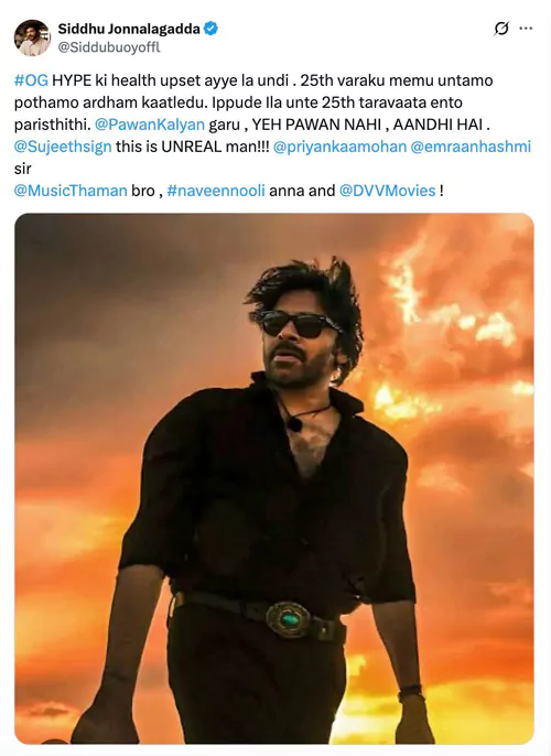 "ఓజీ హైప్కి హెల్త్ అప్సెట్ అయ్యేలా ఉంది. సెప్టెంబర్ 25 వరకు మేము ఉంటామో పోతామో అర్థం కావట్లేదు. ఇప్పుడే ఇలా ఉంటే, 25 తర్వాత ఏంటో పరిస్థితి. పవన్ కళ్యాణ్ గారు ఒక తుఫాన్." అంటూ సిద్ధు ఎక్స్ వేదికగా పోస్ట్ చేశాడు. ఈ పోస్ట్ ఇప్పుడు సోషల్ మీడియాలో వైరల్ అవుతోంది.