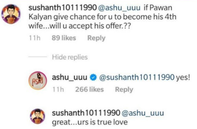 పవన్ రాసిన లెటర్ని కూడా షేర్ చేసింది. ప్రస్తుతం ఇది సోషల్ మీడియాలో వైరల్ కావడంతో నెటిజన్స్ అషు రెడ్డిపై ప్రశ్నల వర్షం కురిపిస్తున్నారు. "ఒకవేళ నాలుగో భార్యగా పవన్మీకు అవకాశం ఇస్తే ఇప్పుకుంటారా?" అని ఓ నెటిజన్ అడిగితే వెంటనే "యస్" అనేసింది అషు రెడ్డి.