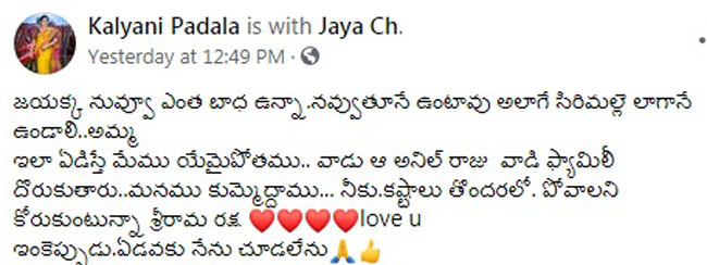 తన ఫేస్బుక్ హ్యాండిల్ ద్వారా స్పందించిన కల్యాణి, "జయక్కా నువ్వు ఎంత బాధ ఉన్నా నవ్వుతూనే ఉంటావు. అలాగే సిరిమల్లె లాగానే ఉండాలి.. అమ్మ ఇలా ఏడిస్తే మేము యేమైపోతము. వాడు ఆ అనిల్ రాజు, వాడి ఫ్యామిలీ దొరుకుతారు.. మనము కుమ్మేద్దాము.. నీకు.కష్టాలు తొందరలో పోవాలని కోరుకుంటున్నా. శ్రీరామ రక్ష. love u. ఇంకెప్పుడు ఏడవకు. నేను చూడలేను." అని రాసుకొచ్చారు.