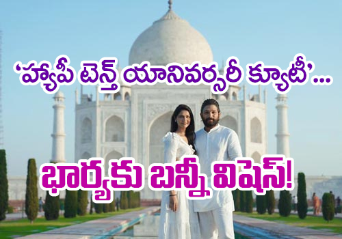 అల్లు అర్జున్, ఆయన భార్య స్నేహా రెడ్డి నేడు (మార్చి 6) పదో పెళ్లిరోజు జరుపుకుంటున్నారు. ఈ స్పెషల్ డే సందర్భంగా తన సోషల్ మీడియా హ్యాండిల్ ద్వారా రెండు స్టన్నింగ్ పిక్చర్స్ షేర్ చేసి, స్నేహకు విషెస్ తెలిపాడు బన్నీ. ఒక ఫొటో తాజ్ మహల్ ముందు నిల్చొని తీయించుకున్నది కాగా, మరొకటి వారి పెళ్లి నాటిది. 2011 మార్చి 6న వైభవంగా జరిగిన వేడుకలో స్నేహ మెడలో మూడు ముళ్లు వేశాడు బన్నీ.