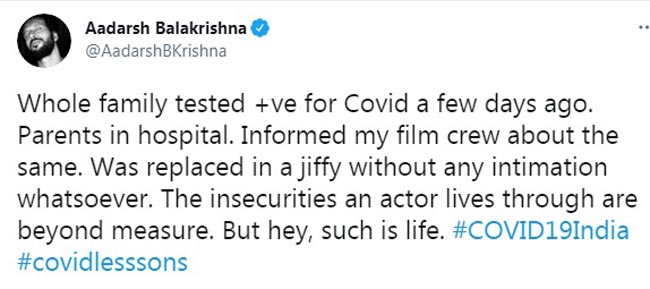 దీంతో షాక్కు గురయ్యాడు ఆదర్శ్. తన ఆవేదనను ట్విట్టర్ హ్యాండిల్ ద్వారా చేసిన పోస్ట్ ద్వారా వెల్లడించాడు. "కొద్ది రోజుల క్రితం మా మొత్తం ఫ్యామిలీ కొవిడ్ పాజిటివ్గా నిర్ధారణ అయ్యింది. పేరెంట్స్ హాస్పిటల్లో ఉన్నారు. ఇదే విషయం నా సినిమా టీమ్కు చెప్పాను. మాట మాత్రం చెప్పకుండా నన్ను తీసేశారు. ఒక నటుడి జీవితం ఎంతగా అభద్రతల్లో ఉంటుందనేది ఊహాతీతం. కానీ, అదేగా జీవితం." అని ట్వీట్ చేశాడు ఆదర్శ్.