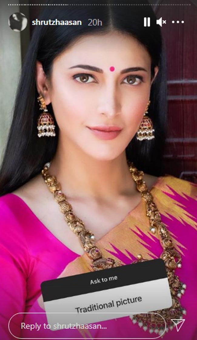 కొద్ది కాలం తెలుగు సినిమాలకు దూరంగా ఉండి, 'క్రాక్' మూవీతో మళ్లీ మనముందుకు వచ్చి అలరించింది శ్రుతి హాసన్. 'వకీల్ సాబ్'లో పవన్ కల్యాణ్ భార్యగా స్పెషల్ రోల్లో ఆకట్టుకుంది. అంతే కాదు, ఏకంగా 'సలార్' లాంటి క్రేజీ పాన్ ఇండియా ఫిల్మ్లో ప్రభాస్ జోడీగా ఎంపికై ఆశ్చర్యపరిచింది. ఇలా తన రి-ఎంట్రీతో అదరగొడుతోన్న శ్రుతి మంగళవారం తన ఇన్స్టాగ్రామ్ ఫాలోయర్స్తో సరదాగా ముచ్చటించింది.