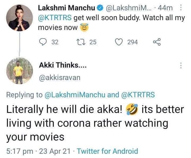 అయితే వీరందరిలో నటి మంచు లక్ష్మి చేసిన ట్వీట్ సోషల్ మీడియా యూజర్స్ను బాగా ఆకర్షించింది. దానిపై వారు మామూలుగా స్పందించలేదు. ఇంతకీ ఆమె ఏమని ట్వీట్ చేసిందంటే.. "కేటీఆర్.. త్వరగా కోలుకో బడ్డీ. ఇప్పుడు నా సినిమాలన్నీ చూడు." ఈ ట్వీట్తో పాటు ,దానికి అక్కి శ్రావణ్ అనే యూజర్ చేసిన కామెంట్ కలిసి సోషల్ మీడియాలో వైరల్ అయ్యాయి. వాట్సప్ గ్రూపుల్లో ఇవి బాగా షేర్ అవుతున్నాయి.