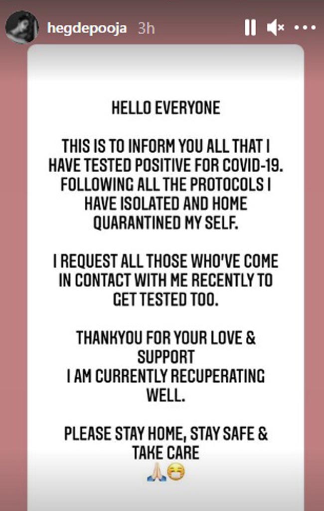 కొవిడ్ సెకండ్ వేవ్ దెబ్బకు వారూ వీరూ అని లేకుండా అన్ని వర్గాల వారూ, అన్ని వయసుల వారూ ప్రభావితమవుతున్నారు. సౌత్ నుంచి నార్త్ దాకా ఇప్పటికే పలువురు సినీ సెలబ్రిటీలు కొవిడ్ బారిన పడగా, లేటెస్ట్గా ఆ లిస్ట్లో సౌత్ ఇండియన్ టాప్ యాక్ట్రెస్ పూజా హెగ్డే కూడా చేరింది. ఆమెకు ఆదివారం రాత్రి కొవిడ్-19 పాజిటివ్గా నిర్ధారణ అయ్యింది. ఈ విషయాన్ని ఆమె తన ఇన్స్టాగ్రామ్ స్టోరీ ద్వారా వెల్లడించింది.