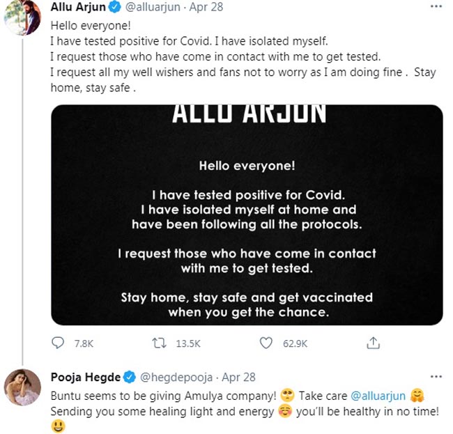 రెండు రోజుల క్రితం తనకు కొవిడ్-19 పాజిటివ్గా నిర్ధారణ అయ్యిందంటూ సోషల్ మీడియా హ్యాండిల్ ద్వారా బన్నీ వెల్లడించాడు. దానికి పూజ స్పందిస్తూ, "అమూల్యకు బంటు కంపెనీ ఇస్తున్నట్లుగా ఉంది! జాగ్రత్తగా ఉండు అల్లు అర్జున్. నీకు కొంత హీలింగ్ లైట్ను, ఎనర్జీని పంపుతున్నా. నువ్వు త్వరగా ఆరోగ్యవంతుడివి అవుతావ్!" అని రిప్లై ఇచ్చింది. ఆమె కామెంట్ ఇప్పుడు వైరల్ అవడమే కాకుండా, సోషల్ మీడియాలో టాక్ ఆఫ్ ద పాయింట్ అయింది. ఇద్దరి ఫ్యాన్స్ పూజ రియాక్షన్పై తెగ కామెంట్లు చేస్తున్నారు.