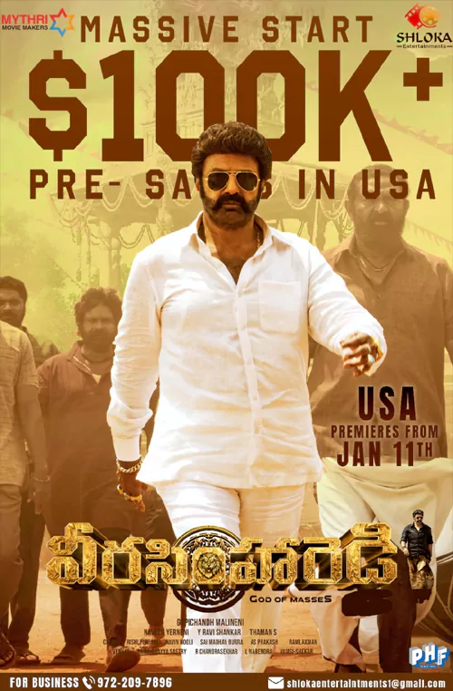 యూఎస్ లో 'వీర సింహా రెడ్డి' అడ్వాన్స్ బుకింగ్స్ కి సూపర్ రెస్పాన్స్ వస్తోంది. విడుదలకు ఇంకా తొమ్మిది రోజుల సమయం ఉండగానే.. ప్రీ సేల్స్ లో అప్పుడే 100K(లక్ష) డాలర్ల మార్క్ ని దాటేసింది. యూఎస్ లో జనవరి 11 నుంచి ప్రీమియర్స్ ఉంటాయి. 'వీర సింహా రెడ్డి' జోరు చూస్తుంటే ప్రీమియర్స్, ఫస్ట్ డే కలిపే యూఎస్ లో హాఫ్ మిలియన్ మార్క్ అందుకునేలా ఉంది.