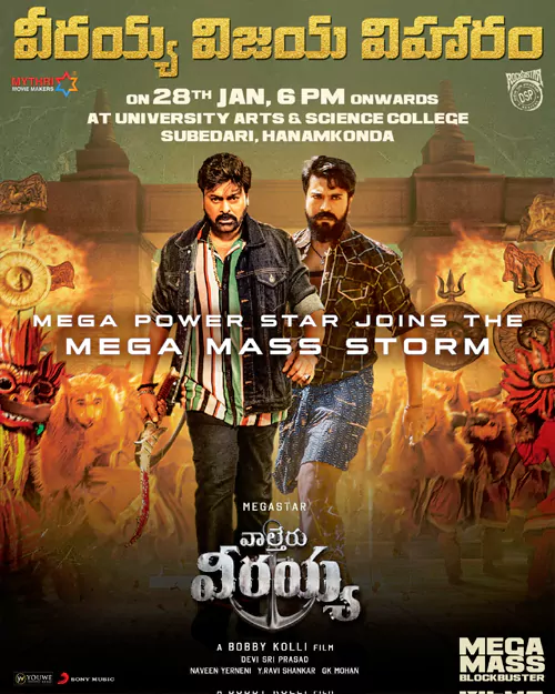 మైత్రి మూవీ మేకర్స్ నిర్మించిన ఈ చిత్రానికి బాబీ కొల్లి దర్శకుడు. ఇందులో మాస్ మహారాజా రవితేజ కీలక పాత్రలో అలరించాడు. సంక్రాంతికి విడుదలైన ఈ చిత్రంలో చిరంజీవి కామెడీ టైమింగ్ కి ఫ్యాన్స్ ఫిదా అయ్యారు. వింటేజ్ మెగాస్టార్ ని చూడటానికి పెద్ద ఎత్తున థియేటర్లకు కదిలారు. ఇక చిరు-రవితేజ మధ్య వచ్చే సన్నివేశాలు కూడా ప్రేక్షకులను విశేషంగా ఆకట్టుకున్నాయి. అందుకే ఈ చిత్రానికి బాక్సాఫీస్ దగ్గర ఆ స్థాయిలో వసూళ్ల వర్షం కురుస్తోంది. ఈ భారీ విజయంలో మెగా ఫ్యాన్స్ బాగా ఉత్సాహంగా ఉన్నారు. వారి ఉత్సాహాన్ని రెట్టింపు చేస్తూ మైత్రి మేకర్స్ భారీ సక్సెస్ మీట్ నిర్వహించడానికి సిద్ధమైంది. 'వీరయ్య విజయ విహారం' పేరుతో రేపు(జనవరి 28న) సాయంత్రం హన్మకొండ యూనివర్సిటీ కాలేజ్ లో జరగనున్న ఈ వేడుకకు మూవీ టీమ్ తో పాటు రామ్ చరణ్ కూడా హాజరవుతున్నాడు.