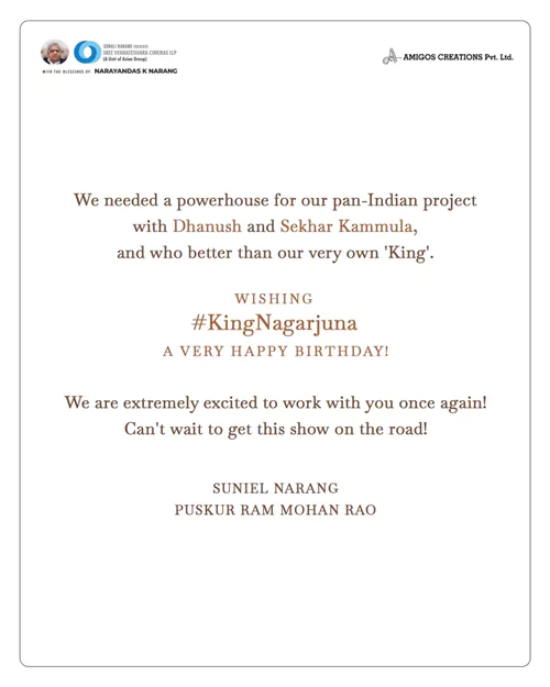 ఆ వివరాల్లోకి వెళితే.. తమిళ కథానాయకుడు ధనుష్ హీరోగా శేఖర్ కమ్ముల దర్శకత్వంలో ఓ పాన్ ఇండియా మూవీ రాబోతున్న సంగతి తెలిసిందే. ఇందులో రష్మికా మందన్న కథానాయికగా నటిస్తుండగా.. సునీల్ నారంగ్, పుష్కర్ రామ్మోహన్ రావు నిర్మిస్తున్నారు. కాగా, ఈ ప్రాజెక్ట్ లో నాగ్ కూడా కనిపించనున్నారని ఆ మధ్య కథనాలు వచ్చాయి. అవి నిజమని నిరూపిస్తూ.. చిత్ర నిర్మాణ సంస్థ నాగ్ ఎంట్రీపై అధికారిక ప్రకటన ఇచ్చేసింది. ధనుష్, శేఖర్ కమ్ములతో తీస్తున్న పాన్ ఇండియా మూవీకి ఓ పవర్ హౌస్ అవసరమైందని.. కింగ్ కంటే ఇంకెవరు బెటర్ గా ఉంటారంటూ నాగ్ కి బర్త్డ్ డే విషెస్ తెలిపి మరీ అనౌన్స్ ఇచ్చేశారు. మరి.. నాగ్, ధనుష్, శేఖర్ కమ్ముల, రష్మికా మందన్న క్రేజీ కాంబోలో రాబోతున్న ఈ పాన్ ఇండియా వెంచర్.. ఏ స్థాయిలో సెన్సేషన్ క్రియేట్ చేస్తుందో చూడాలి.