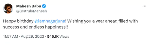ఆగస్టు 29న నాగార్జున పుట్టినరోజు కావడంతో శుభాకాంక్షలు వెల్లువెత్తాయి. ఈ క్రమంలోనే మహేష్ బాబు కూడా ఆయనకు ట్విట్టర్ వేదికగా విషెస్ చెప్పారు. అయితే విష్ చేయడం వరకు ఓకే గానీ, 'హ్యాపీ బర్త్ డే నాగార్జున' అని ట్వీట్ చేయడమే చర్చకు దారితీసింది. తనకంటే సీనియర్ అయిన నాగార్జునకు గారు లేదా సార్ అని రెస్పెక్ట్ ఇవ్వకుండా.. పేరు పెట్టి పిలవడంపై విమర్శలు వస్తున్నాయి. సీనియర్స్ కి రెస్పెక్ట్ ఇవ్వాలని తెలీదా?, ఇదేమి సంస్కారం అంటూ కొందరు ఫైర్ అవుతున్నారు. విష్ చేసినందుకు సంతోషంగా ఉన్నా, ఇలా రెస్పెక్ట్ ఇవ్వకుండా విష్ చేయడం బాలేదంటూ కొందరు అక్కినేని ఫ్యాన్స్ అసహనం వ్యక్తం చేస్తున్నారు. అయితే మహేష్ ఇలా విష్ చేయడానికి కారణం నాగార్జునతో ఆయనకున్న చనువే అని చెప్పొచ్చు.