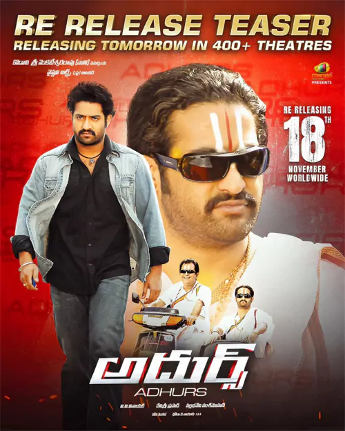 జూనియర్ ఎన్టీఆర్ కెరీర్ లో ఆల్ టైం ఎంటర్టైనర్ గా పేరు తెచ్చుకున్న మూవీ 'అదుర్స్'. వీవీ వినాయక్ దర్శకత్వంలో రూపొందిన ఈ సినిమాలో చారి-భట్టు గా ఎన్టీఆర్-బ్రహ్మానందం పంచిన వినోదాన్ని ప్రేక్షకులు అంత తేలికగా మరిచిపోలేరు. 2010 విడుదలైన ఈ సినిమా 13 ఏళ్ళ మళ్ళీ థియేటర్లలో సందడి చేయనుంది. ఈ సినిమాని నవంబర్ 18న రీరిలీజ్ చేస్తున్నారు. అయితే ఇప్పుడు ఈ మూవీ రీరిలీజ్ టీజర్ కి సంబంధించిన అప్డేట్ వచ్చింది. తెలుగు రాష్ట్రాల్లోని 400కి పైగా థియేటర్లలో అదుర్స్ రీరిలీజ్ టీజర్ ని ప్రదర్శించనున్నారు. అంటే రేపు థియేటర్లలో బాబాయ్ తో పాటు అబ్బాయ్ కూడా సందడి చేయనున్నాడన్నమాట. ఇది నందమూరి ఫ్యాన్స్ కి గుడ్ న్యూస్ అనే చెప్పాలి.