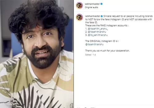 తన కూతురు సాహితి పేరు మీద కొన్ని ఫేక్ అకౌంట్స్ ఓపెన్ చేసి బ్రాండ్స్ ని ప్రమోట్ చేస్తామంటూ మెసేజెస్ పంపించి డబ్బులు డిమాండ్ చేస్తున్నారనే విషయం శేఖర్ మాస్టర్ దృష్టికి వచ్చేసరికి ఆయన ఇన్స్టాగ్రామ్ లో ఒక వీడియోని రిలీజ్ చేశారు. “మీ బ్రాండ్స్ ని ప్రమోట్ చేస్తాను అంటూ కొన్ని ఫేక్ అకౌంట్స్ నా కూతురి పేరుపై క్రియేట్ చేసి మెసేజ్లు పెడుతున్నారట. ప్రమోషన్ కోసం డబ్బును తీసుకుని తర్వాత రెస్పాండ్ కావడం లేదు. దయచేసి అలాంటివి నమ్మకండి .. నా కూతురుకు ఉండే ఐడి ఇదే ..నా కూతురు ఐడిని నేను ఫాలో అవుతున్నాను. మిగతా ఉన్నవి ఫేక్ అకౌంట్ నా కూతురుకి సంబంధించినవి కాదు. ఫేక్ ఐడీతో కొలాబరేట్ అవకండి " అని చెప్పి తన కూతురు ఒరిజినల్ ఇన్స్టా ఐడీని పోస్ట్ చేశారు. ఇప్పుడు ఈ వీడియో వైరల్ అవుతోంది.