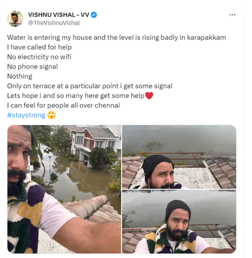 తాను నివాసం ఉంటున్న ప్రాంతంలో బాగా వరద పెరిగిపోతోందని, తనతో పాటు ఎందరో సాయం కోసం ఎదురుచూస్తున్నామని విష్ణు విశాల్ తాజాగా ట్వీట్ చేశాడు. "నా ఇంట్లోకి నీరు చేరుతోంది మరియు కరపాక్కంలో నీటి మట్టం దారుణంగా పెరుగుతోంది. నేను సహాయం కోరాను. ఇక్కడ కరెంటు లేదు, వైఫై లేదు.. ఫోన్ సిగ్నల్ కూడా లేదు. టెర్రస్ మీద ఒక చోట మాత్రమే నాకు కొంత సిగ్నల్ వస్తుంది. ఈ ప్రాంతంలో నాతో ఉన్న చాలా మందికి సహాయం అందుతుందని ఆశిద్దాం." అని రాసుకొచ్చిన విష్ణు విశాల్ కొన్ని ఫొటోలను కూడా షేర్ చేశాడు. ప్రస్తుతం ఈ ట్వీట్ వైరల్ గా మారింది. అధైర్య పడకుండా జాగ్రత్తగా ఉండాలని విష్ణు విశాల్ కి అభిమానులు సూచిస్తున్నారు.