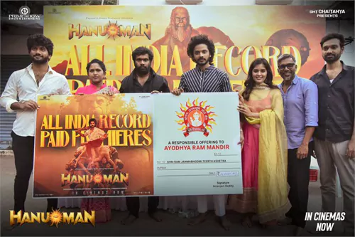 హనుమాన్ ప్రీ రిలీజ్ ఈవెంట్ లో దర్శకుడు ప్రశాంత్ వర్మ ,ప్రొడ్యూసర్ నిరంజన్ రెడ్డి లు హనుమాన్ సినిమా ఆడినన్ని రోజులు కూడా టికెట్ మీద వచ్చే తమకి వచ్చే అమౌంట్ లో ప్రతి ఐదు రూపాయలని అయోధ్య రామ మందిరానికి విరాళంగా ఇస్తామని ప్రకటించారు. ఇప్పుడు ఆ మాటకి తగ్గట్టే హనుమాన్ ప్రీమియర్ షో ల ద్వారా వచ్చిన అమౌంట్ 14 .25 లక్షలని అయోధ్యకి విరాళంగా ఇచ్చింది. ఈ మేరకు ప్రెస్ మీట్ పెట్టి మరీ చిత్ర బృందం ప్రకటించింది.ఈ కార్యక్రమంలో హీరో తేజ సజ్జ , హీరోయిన్ అమృత అయ్యర్, దర్శకుడు ప్రశాంత్ వర్మ, నిర్మాత నిరంజన్ రెడ్డి తదితరులు పాల్గొన్నారు.