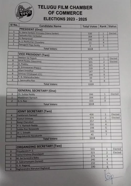 తెలుగు ఫిల్మ్ ఛాంబర్ లో జరిగిన దర్శకుల సంఘం ఎన్నికల్లో మొత్తం 1113 ఓట్లు పోలయ్యాయి. ప్రెసిడెంట్ గా 232 ఓట్ల మెజారిటీ తో సముద్రపై వీర శంకర్ గెలుపొందారు. వైస్ ప్రెసిడెంట్స్ గా 576 ఓట్లతో సాయి రాజేష్, 355 ఓట్లతో వశిష్ఠ ఎన్నికయ్యారు. జనరల్ సెక్రటరీగా సుబ్బారెడ్డి(396) రెండు ఓట్ల మెజారిటీతో మద్దినేని రమేష్(394) పై గెలిచారు. జాయింట్ సెక్రటరీలుగా 436 ఓట్లతో వడ్డాణం రమేష్, 374 ఓట్లతో కస్తూరి శ్రీనివాస్ ఎన్నికయ్యారు. ఆర్గనైజింగ్ సెక్రటరీలు గా ప్రియదర్శి, వంశీకృష్ణ.. ట్రెజరర్ గా పి.వి.రామారావు రావు విజయం సాధించారు. ఎగ్జిక్యూటివ్ కమిటీ మెంబెర్స్ గా కృష్ణ మోహన్, ఆకాష్, రాజా, శైలేష్ కొలను, శ్రీరామ్ ఆదిత్య, కూరపాటి రామారావు, లక్ష్మణ్ రావు, ప్రవీణ, రమణ, కొండా విజయ్ కుమార్ ఎన్నికయ్యారు.