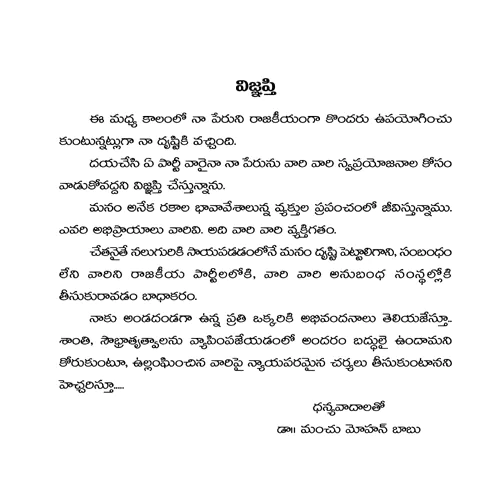 'విజ్ఞప్తి' పేరుతో తాజాగా మోహన్ బాబు సోషల్ మీడియా వేదికగా ఒక నోట్ ను రిలీజ్ చేశారు. "ఈ మధ్య కాలంలో నా పేరుని రాజకీయంగా కొందరు ఉపయోగించు కుంటున్నట్లుగా నా దృష్టికి వచ్చింది. దయచేసి ఏ పార్టీ వారైనా నా పేరును వారి వారి స్వప్రయోజనాల కోసం వాడుకోవద్దని విజ్ఞప్తి చేస్తున్నాను. మనం అనేక రకాల భావావేశాలున్న వ్యక్తుల ప్రపంచంలో జీవిస్తున్నాము. ఎవరి అభిప్రాయాలు వారివి. అది వారి వారి వ్యక్తిగతం. చేతనైతే నలుగురికి సాయపడడంలోనే మనం దృష్టి పెట్టాలిగాని, సంబంధం లేని వారిని రాజకీయ పార్టీలలోకి, వారి వారి అనుబంధ సంస్థల్లోకి తీసుకురావడం బాధాకరం. నాకు అండదండగా ఉన్న ప్రతి ఒక్కరికి అభివందనాలు తెలియజేస్తూ.. శాంతి, సౌభ్రాతృత్వాలను వ్యాపింపజేయడంలో అందరం బద్ధులై ఉందామని కోరుకుంటూ, ఉల్లంఘించిన వారిపై న్యాయపరమైన చర్యలు తీసుకుంటానని హెచ్చరిస్తూ..... ధన్యవాదాలతో మంచు మోహన్ బాబు" అని ఆ నోట్ లో పేర్కొన్నారు.