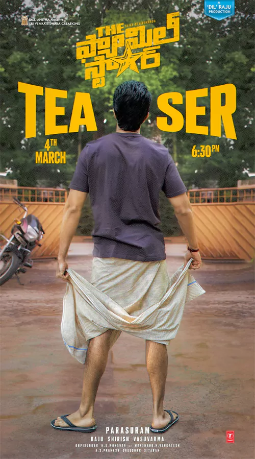 'ఫ్యామిలీ స్టార్' మూవీ టీజర్ రిలీజ్ డేట్ అండ్ టైమ్ ఫిక్స్ చేశారు మేకర్స్. ఈ సినిమా టీజర్ ను రేపు(మార్చి 4) సాయంత్రం 6:30 నిమిషాలకు విడుదల చేయబోతున్నారు. టీజర్ రిలీజ్ అనౌన్స్ మెంట్ సందర్భంగా విడుదల చేసిన కొత్త పోస్టర్ ఆకట్టుకుంటోంది.