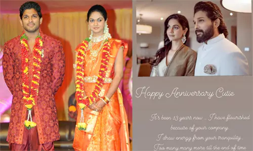 బన్నీ వైఫ్ పేరు స్నేహా. వారిద్దరి వివాహం 2011 మార్చి 6 న జరిగింది. అంటే నేటికీ 13 సంవత్సరాలు కంప్లీట్ అయ్యాయి. ఈ సందర్భంగా స్నేహాకి పెళ్లి రోజు శుభాకాంక్షలు తెలుపుతు బన్నీ చెప్పిన మాటలు పలువురిని ఆకర్షిస్తున్నాయి. నీ వల్లే ఈ ప్రయాణం సంతోషంగా కొనసాగుతుంది.నువ్వు ఎప్పుడు ప్రశాంతంగా ఉంటు నాకు శక్తిని ఇస్తున్నావు. చివరి వరకు మన ప్రేమ ఇలాగే కొనసాగాలి. హ్యాపీ యూనివర్సిరీ క్యూటీ అంటు ట్విట్టర్ లో పోస్ట్ చేసాడు.ఇప్పుడు ఈ పోస్ట్ ట్రెండింగ్ లో ఉంది.పలువురు వెల్ విషర్స్ , ఫ్యాన్స్ ఆ ఇద్దరకీ పెళ్లి రోజు శుభాకాంక్షలు చెప్తున్నారు.