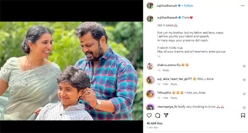 సిల్వర్ స్క్రీన్ మీద డైరెక్టర్ సూర్య కిరణ్ కి మంచి పేరుంది. ఐతే రీసెంట్ గా ఆయన అనారోగ్యంతో మరణించిన విషయం గురించి తెలిసిందే. చాలామంది సూర్యకిరణ్ గురించి ఆల్రెడీ చాలామంది చాలా పోస్టులు కూడా పెట్టారు. కానీ సూర్య కిరణ్ చెల్లెలు సుజిత ధనుష్ కొంచెం లేట్ గా తన ఇన్స్టాగ్రామ్ పేజీలో ఒక పోస్ట్ పెట్టింది. "అన్నయ్య రెస్ట్ ఇన్ పీస్.. నువ్వు నాకు కేవలం అన్నవే కాదు నాన్నవు, హీరోవి కూడా. నీ మాటలని , నీ టాలెంట్ని ఎప్పుడూ గౌరవిస్తూనే ఉంటాను. మరో జన్మ అంటూ ఉంటే నువ్వు కన్న కలలన్నీ నెరవేరాలని కోరుకుంటున్నాను." అని పోస్ట్ చేసింది. సూర్యకిరణ్తో పాటు దిగిన ఒక ఓల్డ్ పిక్ ని కూడా షేర్ చేసింది.