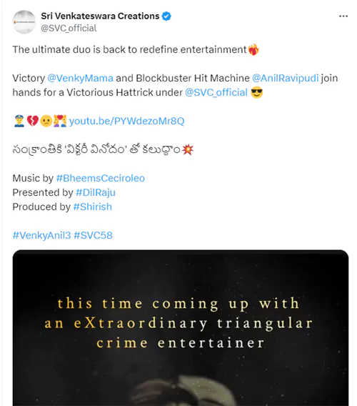 ఉగాది సందర్భంగా వెంకటేష్-రావిపూడి కాంబినేషన్ లో తెరకెక్కనున్న మూడో సినిమా ప్రకటన వచ్చింది. అనౌన్స్ మెంట్ వీడియో ఆకట్టుకుంటోంది. ఇది "ఎక్స్ కాప్(పోలీస్), ఎక్స్ గర్ల్ ఫ్రెండ్, ఎక్సలెంట్ వైఫ్" మధ్య జరిగే కథ అని వీడియోలో చూపించారు. అలాగే ఈసారి ఎక్స్ట్రార్డినరీ ట్రయాంగులర్ క్రైమ్ ఎంటర్టైనర్ తో రాబోతున్నట్లు పేర్కొన్నారు. అంతేకాదు, "సంక్రాంతికి విక్టరీ వినోదంతో కలుద్దాం" అంటూ ఈ చిత్రాన్ని 2025 సంక్రాంతికి విడుదల చేయనున్నట్లు తెలిపారు.