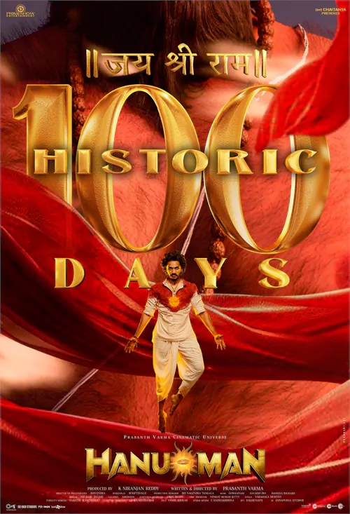 ప్రస్తుత సినీ యుగంలో ఎంత పెద్ద హిట్ సినిమా అయినా మూడు నాలుగు వారాలకే పరిమితమవుతుంది. అలాంటిది హనుమాన్ 100 రోజులు జరుపుకోవడం గ్రేటే. పైగా ఇక్కడ ఆశ్చర్యకరమైన విషయం ఏంటంటే హనుమాన్ గత నెలలో ఓటిటి వేదికగా ప్రేక్షకుల ముందుకు వచ్చింది. అయినా సరే 100 రోజులుని జరుపుకుంటుంది.దీన్ని బట్టి హనుమాన్ ఎంత శక్తిమంతుడో అర్ధం అవుతుంది. అమృత అయ్యర్, వరలక్ష్మి శరత్ కుమార్, సముద్ర ఖని తదితరులు ముఖ్య పాత్రలని పోషించారు. నిరంజన్ రెడ్డి నిర్మాత. 50 రోజులని 150 థియేటర్స్ లో జరుపుకుంది.